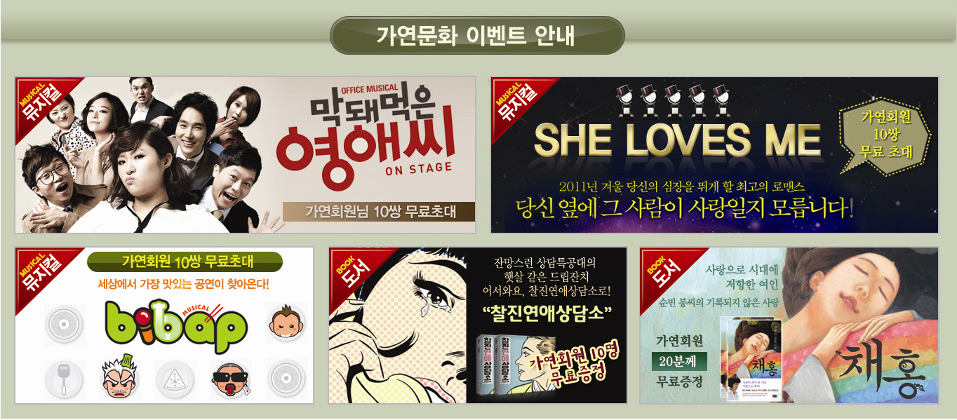 2012³â 1¿ù 4ÀÏ °áÈ¥Á¤º¸È¸»ç °¡¿¬(´ëÇ¥ÀÌ»ç ±è¿µÁÖ, www.gayeon.com)°ú ¿Â¶óÀÎ ¹ÌÆÃ»çÀÌÆ® ¾ÈƼ½Ì±Û(www.antisingle.com)ÀÌ »õÇØ 1¿ùÀ» ¸Â¾Æ ÇÑ´Þ °£ ´Ù¾çÇÑ ¹«·á À̺¥Æ®¸¦ ÁøÇàÇÑ´Ù. ¸ÕÀú Àα⸮¿¡ ¹æ¼ÛµÇ°í ÀÖ´Â ¡®¸·µÅ¸ÔÀº ¿µ¾Ö¾¾¡¯¸¦ ¹ÂÁöÄÃ(~1.8)·Î ¸¸³ªº¼ ¼ö ÀÖ´Â ±âȸ¸¦ Á¦°øÇϸç È·ÁÇÑ À½¾ÇÀÇ Ç⿬ÀÌ µ¸º¸ÀÌ´Â ¹ÂÁöÄà ¡®SHE LOVES ME¡¯(~1.8), ºñºö¹äÀ» ¼ÒÀç·Î ´«°ú ±Í¿Í ÀÔÀ¸·Î Áñ±â´Â ¹ÂÁöÄà ¡®ºñ¹ä¡¯(~1.24)ÀÇ ¹«·áÃÊ´ë±ÇÀ» ÁõÁ¤ÇÑ´Ù. ¶ÇÇÑ ¿¬¾Ö¼¼Æ÷¸¦ ´Ù½Ã ±ú¿öÁÙ ½Å°£µµ¼ ¡®ÂûÁø¿¬¾Ö»ó´ã¼Ò¡¯(~1.31)¿Í Á¶¼±¿ÕÁ¶½Ç·Ï À¯ÀÏÀÇ µ¿¼º¾Ö ½ºÄµµéÀÇ ÁÖÀΰø ¼øºó ºÀ¾¾ÀÇ À̾߱⸦ ´ãÀº ¡®Ã¤È«(¾çÀå)¡¯(~1.31)À» ¹«·á·Î Á¦°øÇÑ´Ù. 1¿ù ¹«·á ¹®È•°ø¿¬ À̺¥Æ®´Â °¡¿¬(www.gayeon.com)°ú ¾ÈƼ½Ì±Û(www.antisingle) ȨÆäÀÌÁö À̺¥Æ® ÆäÀÌÁö¿¡¼ ´©±¸³ª ½ÅûÇÒ ¼ö ÀÖ´Ù.